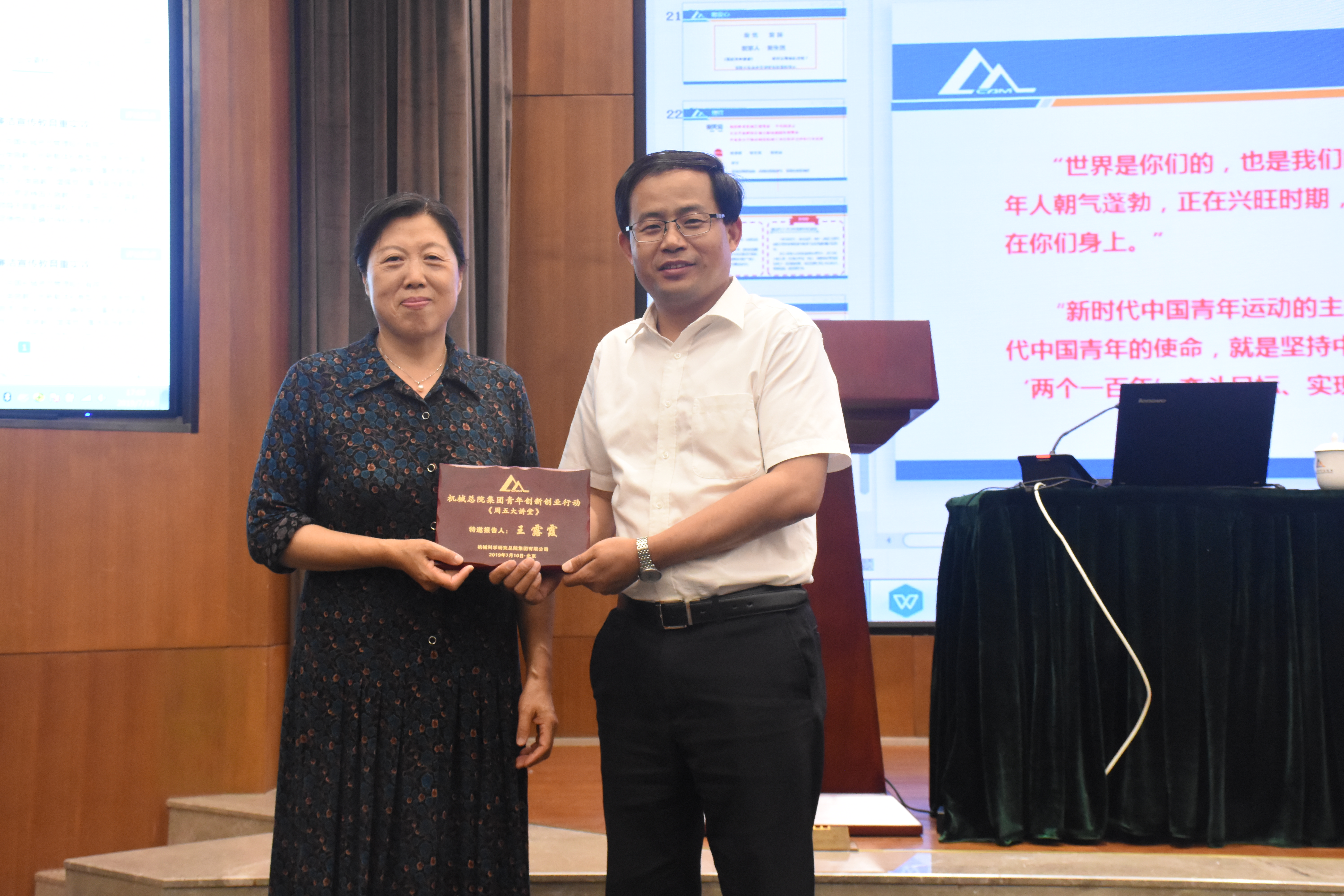 7月16日下午,人資部和機(jī)械總院集團(tuán)團(tuán)委共同舉辦了2019年第六期周五大講堂,本次講堂邀請(qǐng)到原機(jī)械總院黨委副書記、紀(jì)委書記、副院長(zhǎng)王露霞同志,做題為“建功立業(yè)新時(shí)代”的主題講座,集團(tuán)單忠德副總經(jīng)理主持并為王露霞老師頒發(fā)紀(jì)念獎(jiǎng)牌,總院集團(tuán)及在京各二級(jí)單位七十余名研究生、青年員工聆聽(tīng)了本次報(bào)告。